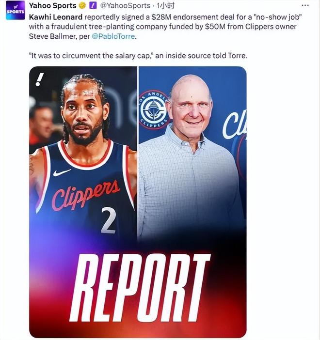與場(chǎng)上慘淡戰(zhàn)績(jī)相呼應(yīng)的是場(chǎng)外不斷發(fā)酵的丑聞。9月初,NBA記者Pablo Torre爆料快船和倫納德之間存在陰陽(yáng)合同。調(diào)查揭露,倫納德曾與一家名為Aspiration的碳中和公司簽訂4年2800萬(wàn)美元的代言合同,但這份工作實(shí)際上是一個(gè)根本不存在的掛名職位。更令人震驚的是,快船老板鮑爾默向這家公司秘密注資5000萬(wàn)美元。
